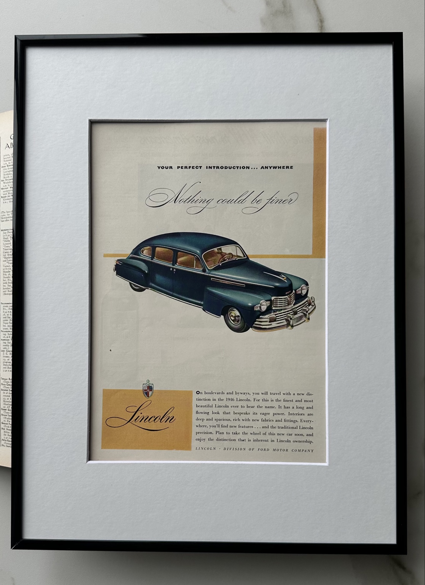 Постер из оригинальной винтажной рекламы автомобиля Lincoln из журнала от 1946 года.