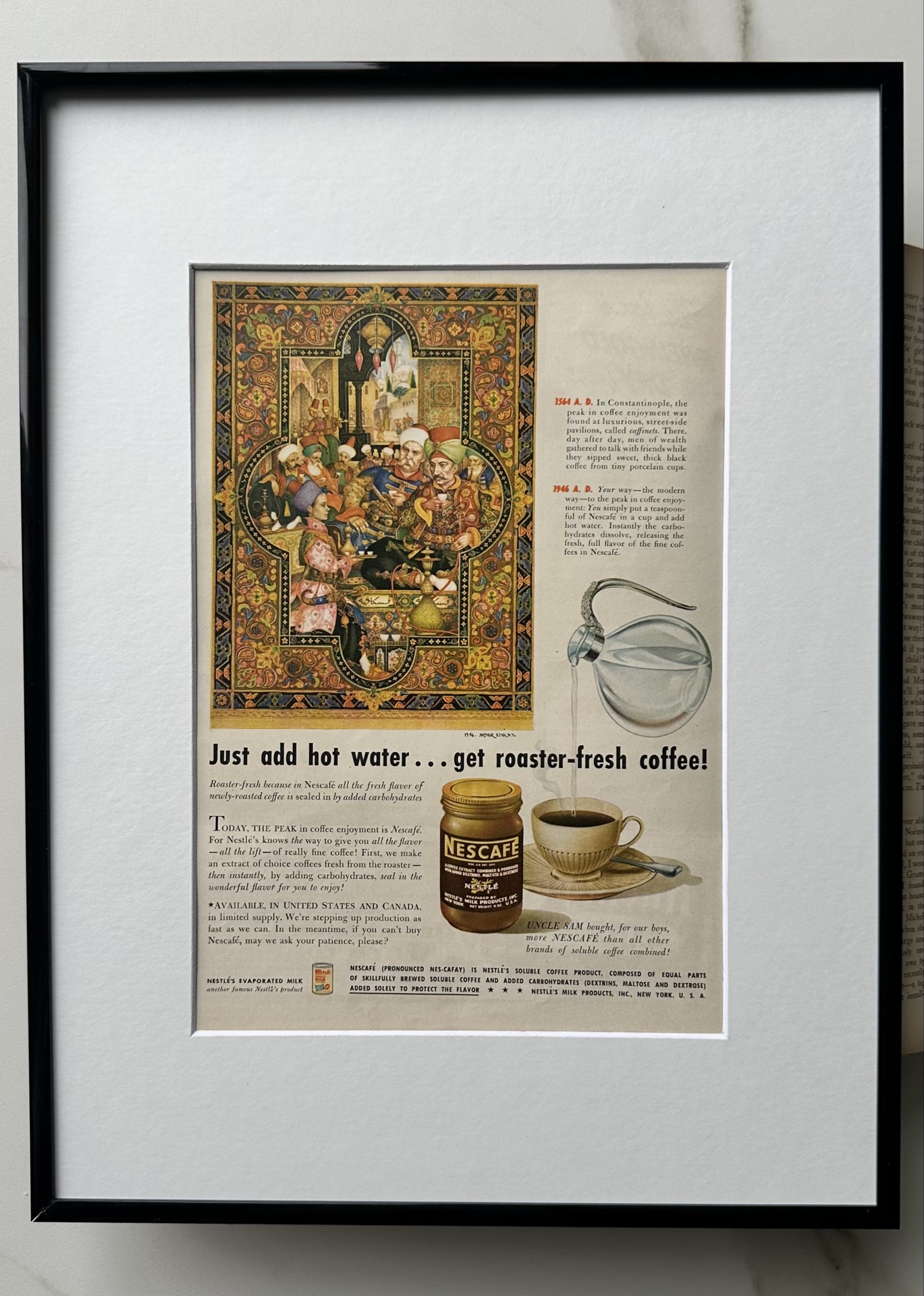 Постер из оригинальной винтажной рекламы кофе Nescafe от 1946 года.